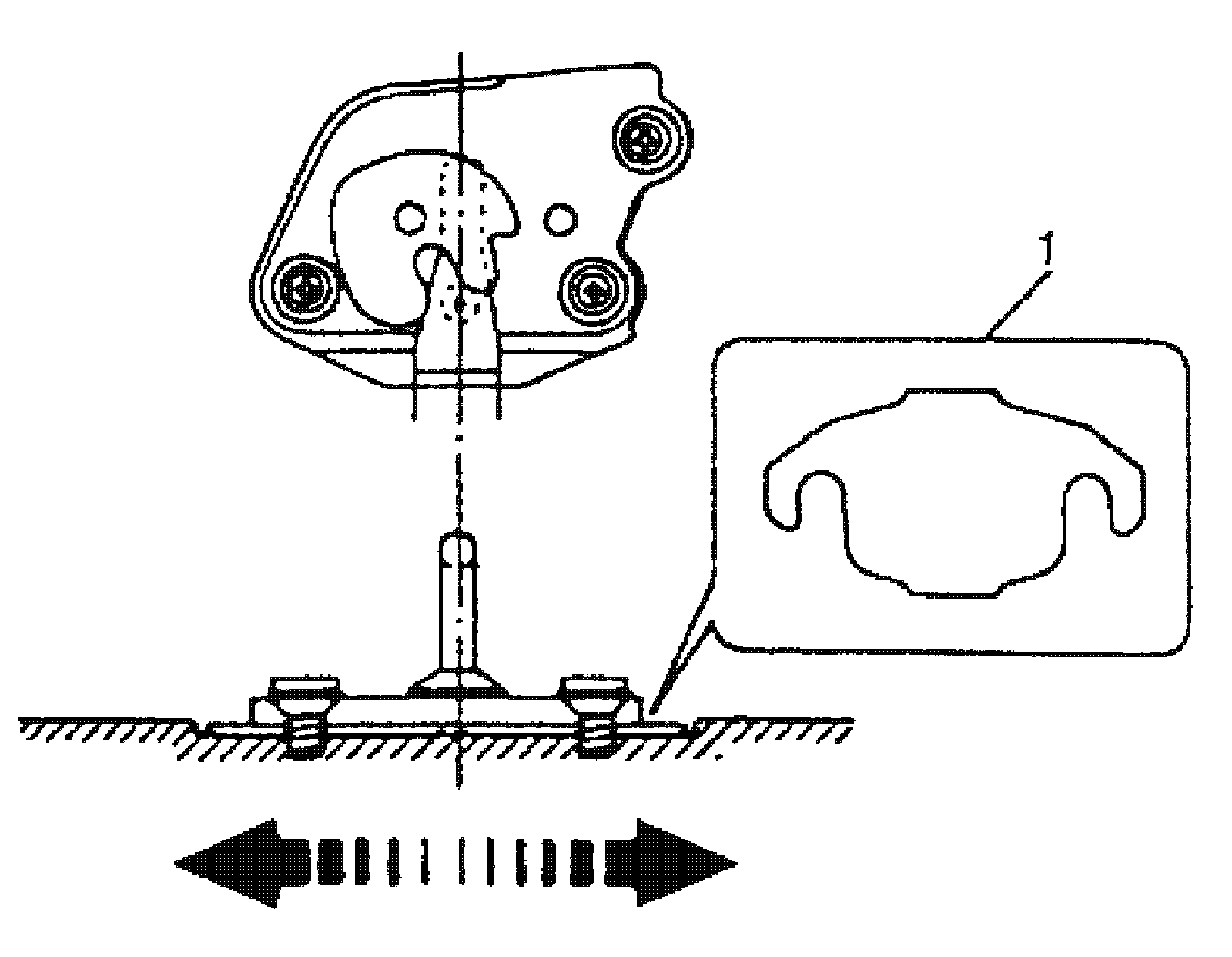 Adjust rear-end door / rear-end gate latch striker so that its center aligns with the center of groove in rear-end door / rear-end gate latch base. To adjust rear-end door / rear-end gate latch and striker with each other, insert proper number of shims (1) below the bottom of striker, as shown.