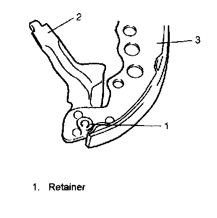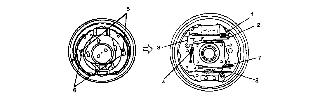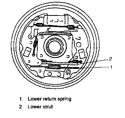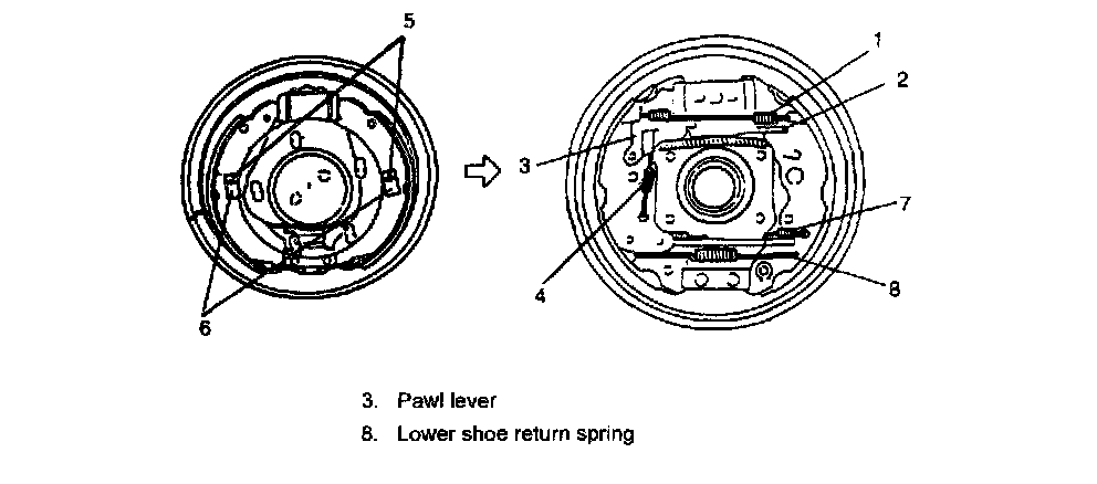 3. Remove upper shoe return spring (1), struts, adjuster (7), adjuster lever (3) and springs (4).