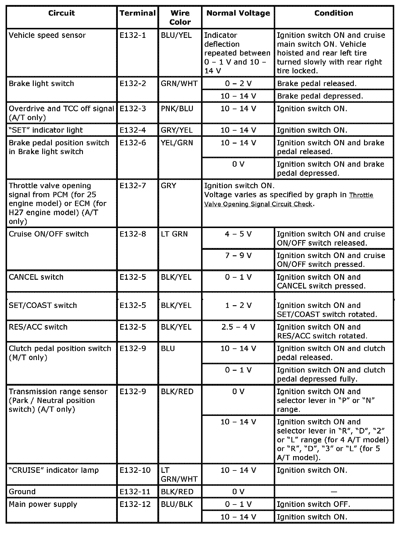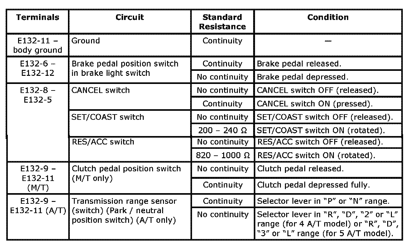 Cruise Control Module and Its Circuit InspectionCAUTION: Cruise control module can not be checked by itself. It is strictly prohibited to connect voltmeter or ohmmeter to cruise control module with coupler disconnected from it.