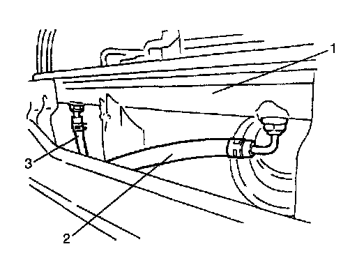 3. When servicing vehicle equipped with Automatic Transmission (A/T), place oil pan under radiator (1) and disconnect A/T fluid hoses (inlet hose (Outlet from oil cooler) (2), outlet hose (inlet to oil cooler) (3)) from radiator (1).