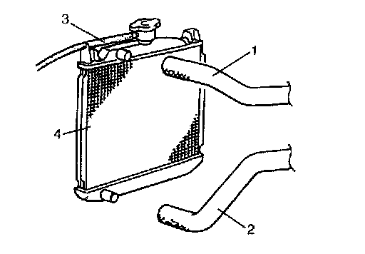 9. Disconnect water hoses (inlet hoe (1), outlet hose (2)) and reservoir hose (3) from radiator (4).
