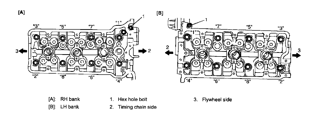 8. Loosen cylinder head bolts in such order as indicated in figure and remove them.