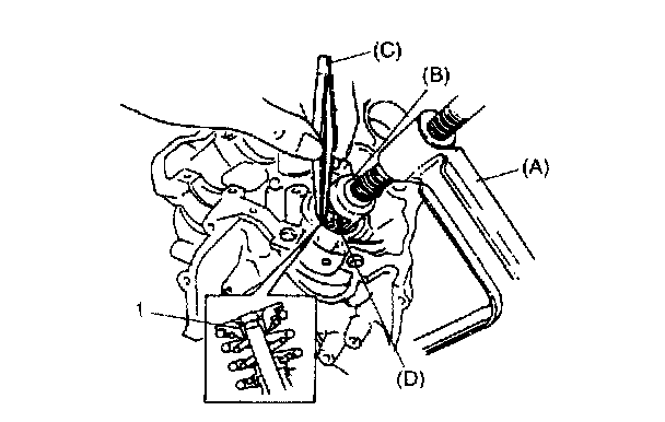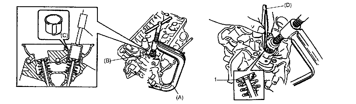1. Using special tools (A), (B) and (C), compress valve springs and then remove valve cotters (1) by using special tool (D).