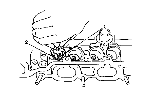 4. Remove valve stem seal (1) from valve guide, and then valve spring seat (2).