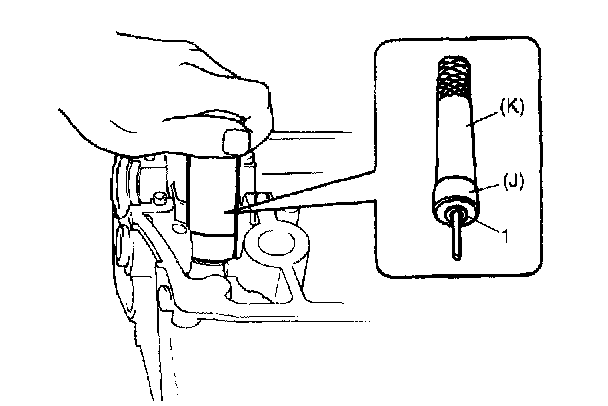 5. Install new valve stem seal (1) to valve guide. After applying engine oil to seal and spindle of special tool (Valve guide installer handle), fit oil seal to spindle, and then install seal to valve guide by pushing special tool by hand. After installing, check to be sure that seal is properly fixed to valve guide.