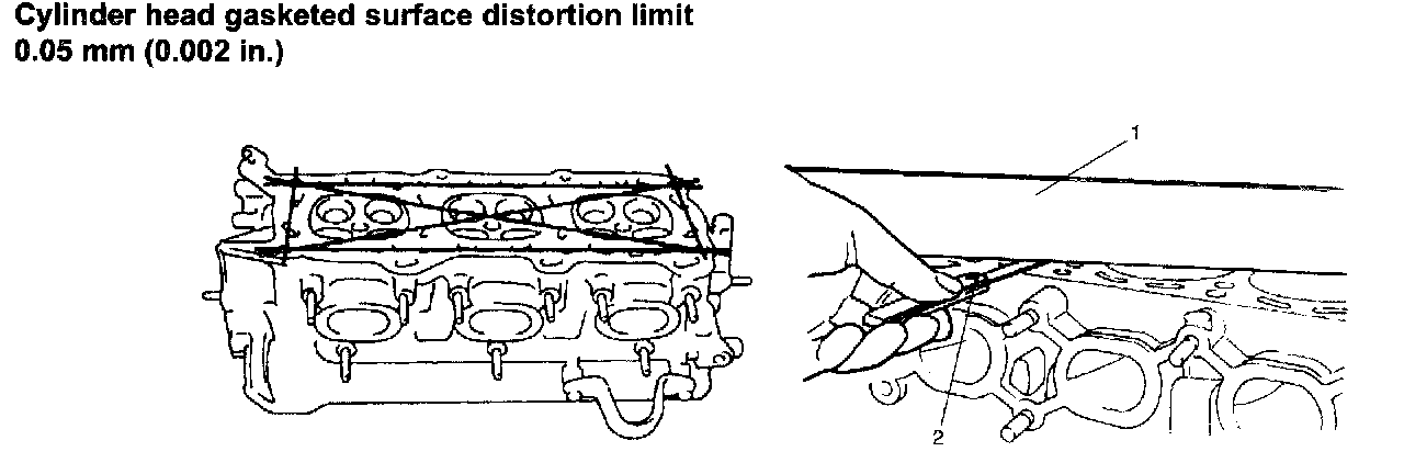 - Check cylinder head for cracks on intake and exhaust ports, combustion chambers, and head surface. Using straightedge (1) and thickness gauge (2), check flatness of gasketed surface at a total of 6 locations. If distortion limit, given, is exceeded, correct gasketed surface with a surface plate and abrasive paper of about #400 (Waterproof silicon carbide abrasive paper): Place abrasive paper on and over surface plate, and rub gasketed surface against paper to grind off high spots. Should this fail to reduce thickness gauge readings to within limit, replace cylinder head. Leakage of combustion gases from this gasketed joint is often due to warped gasketed surface: such leakage results in reduced power output.