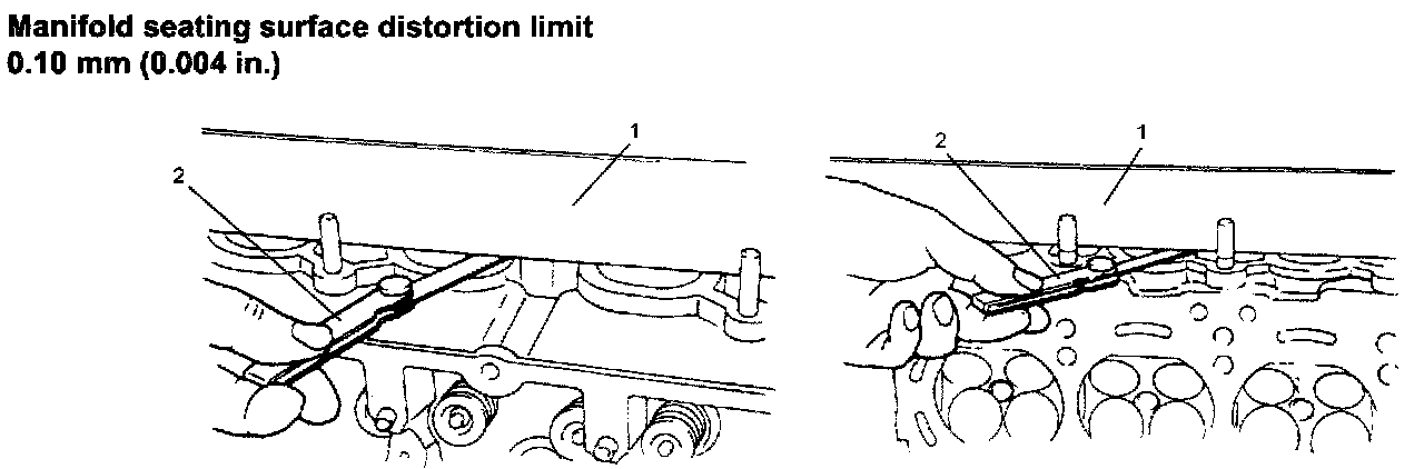 Check seating faces of cylinder head for manifolds, using a straightedge (1) and thickness gauge (2), in order to determine whether these faces should be corrected or cylinder head replaced.