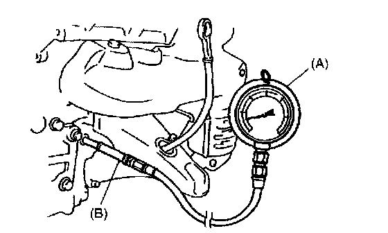2. Install special tool (oil pressure gauge) to vacated threaded hole. For LH steering vehicle, use oil pressure gauge (special tool (A)) with special tool (B) instead of the steel adaptor supplied in special tool (A).
