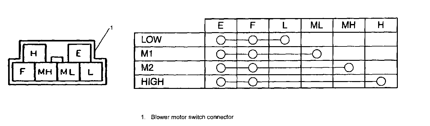 Check heater blower motor switch for each terminal-to-terminal continuity. For the detail refer to "Wiring Circuit Diagram (for Heater and Ventilation):".