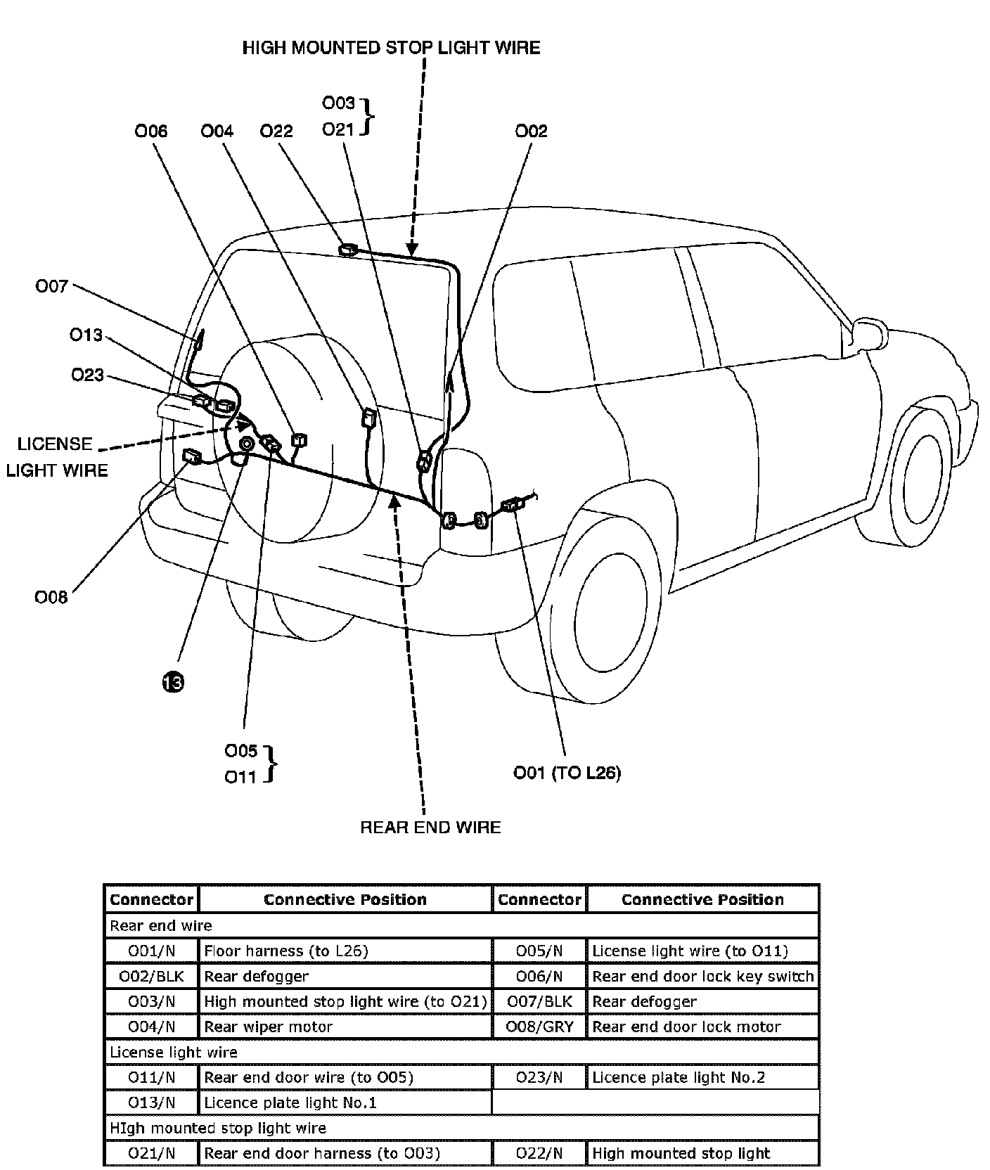 O:Rear End Wire License Light Wire and High Mounted Stop Light Wire: