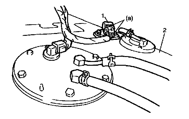 1. Install fuel tank pressure sensor (1) on fuel tank (2) directing sensor terminals to fuel pump side.