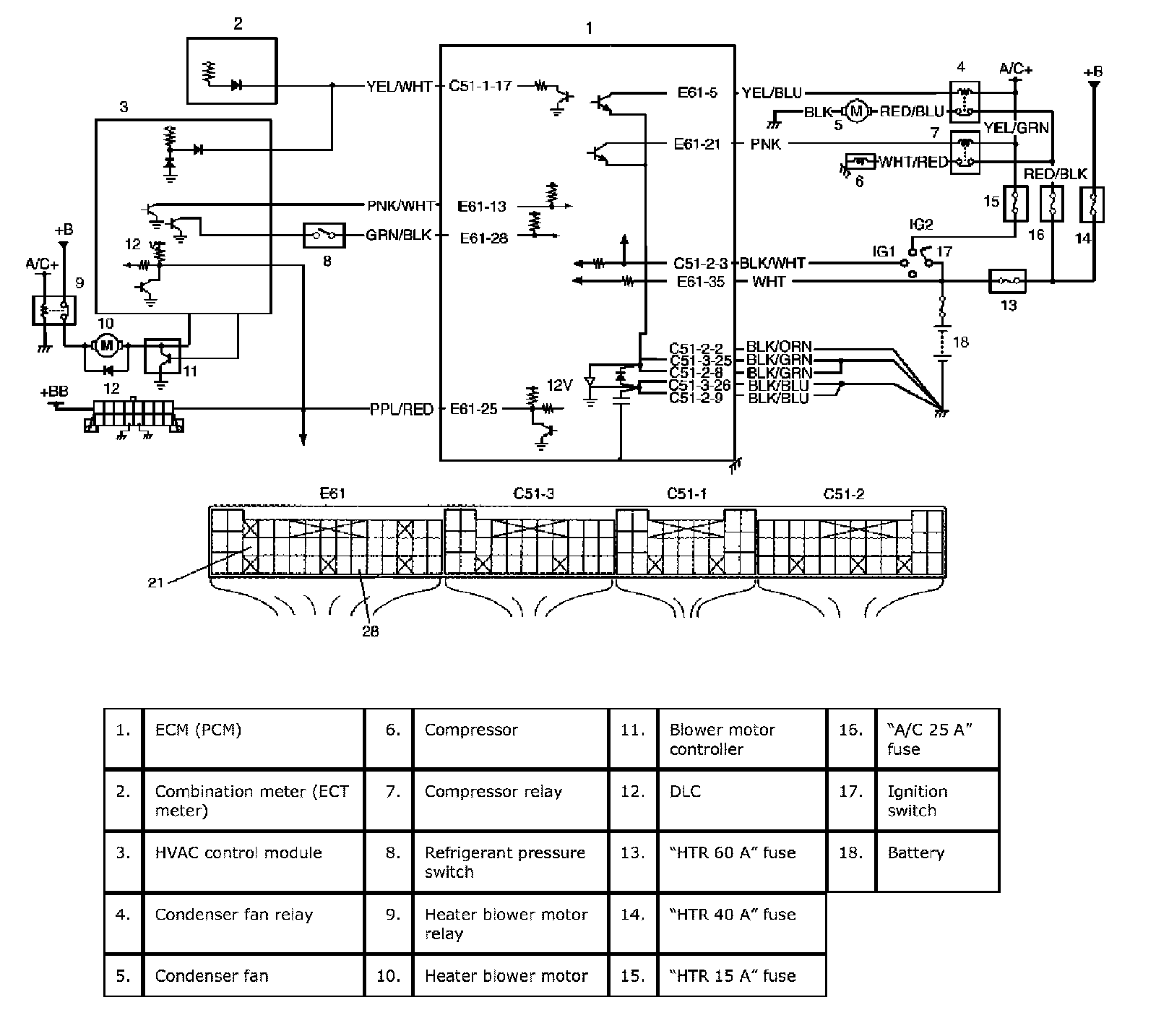 HVAC control module outputs A/C ON signal to ECM (PCM) when A/C switch turned ON and heater blower motor turned ON.