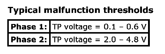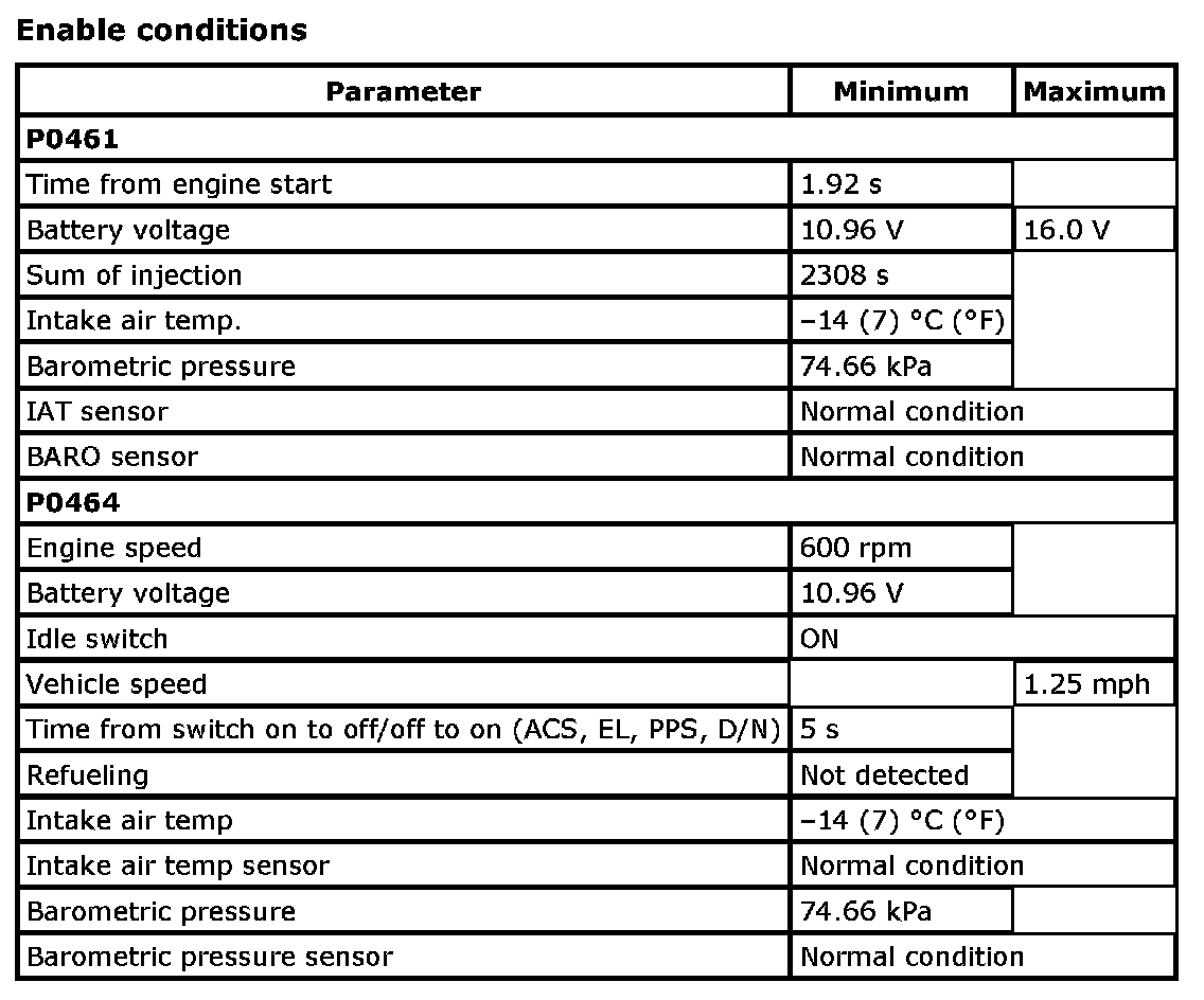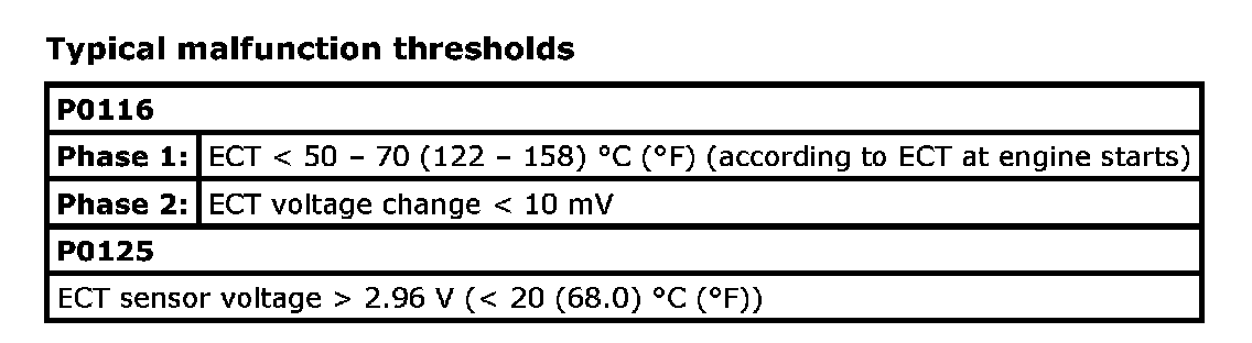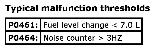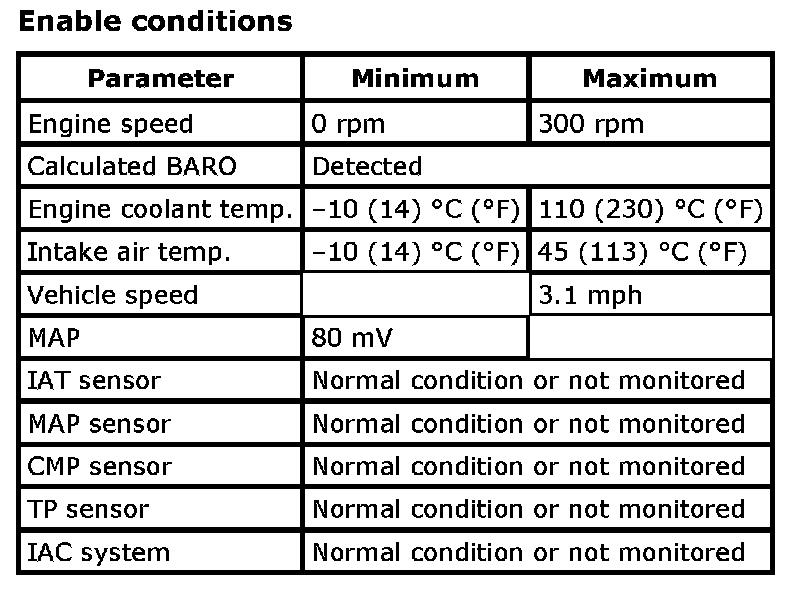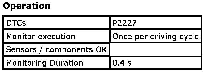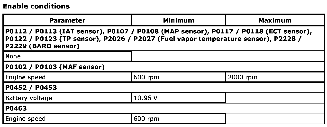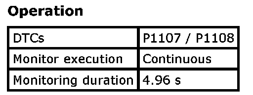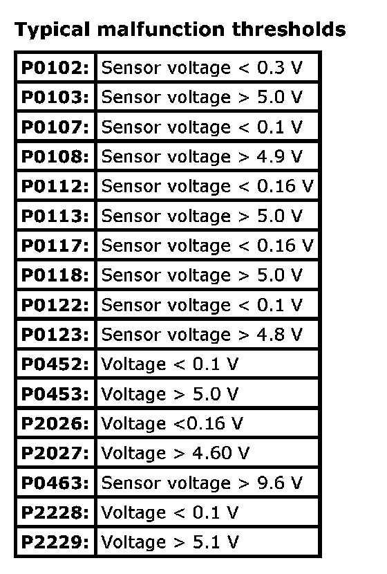 Input signals of MAF (P0102 / P0103), MAP (P0107 / P0108), IAT (P0112 / P0113), ECT (P0117 / P0118), TP (P0122 / P0123), Fuel tank pressure sensor (P0452 / P0453), Fuel vapor temp. sensor (P2026 / P2027), Fuel level sensor (P0463) and Barometric pressure sensor (P2227 / P2228 / P2229) are checked for open, short of circuit by monitoring input voltage.