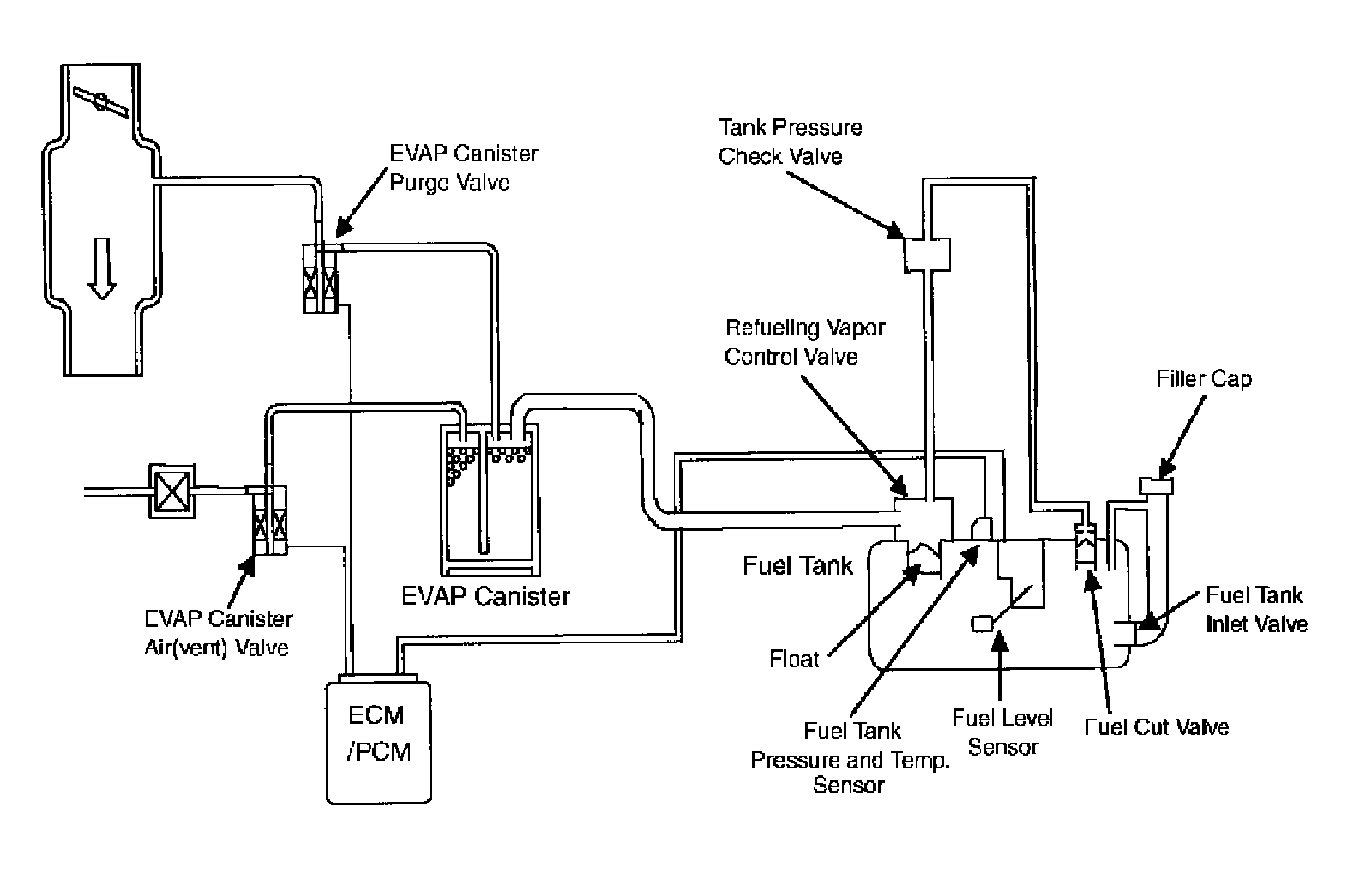 To monitor the EVAP control system, a fuel tank pressure sensor and an EVAP canister air (vent) valve are added to the system.