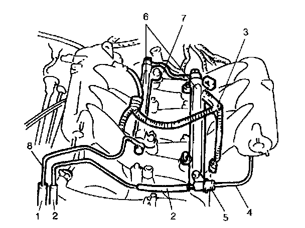 5. Remove fuel feed pipe (8) and fuel connect pipe (7) from delivery pipes (6) (right and left).