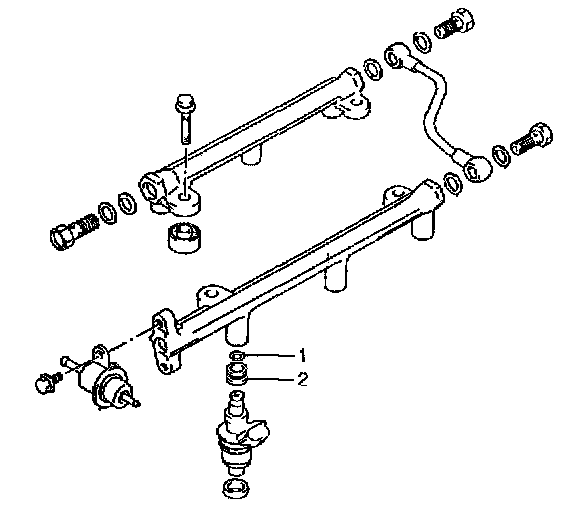 6. Install fuel feed pipe (2) and tighten union bolt to specified torque with new gaskets.