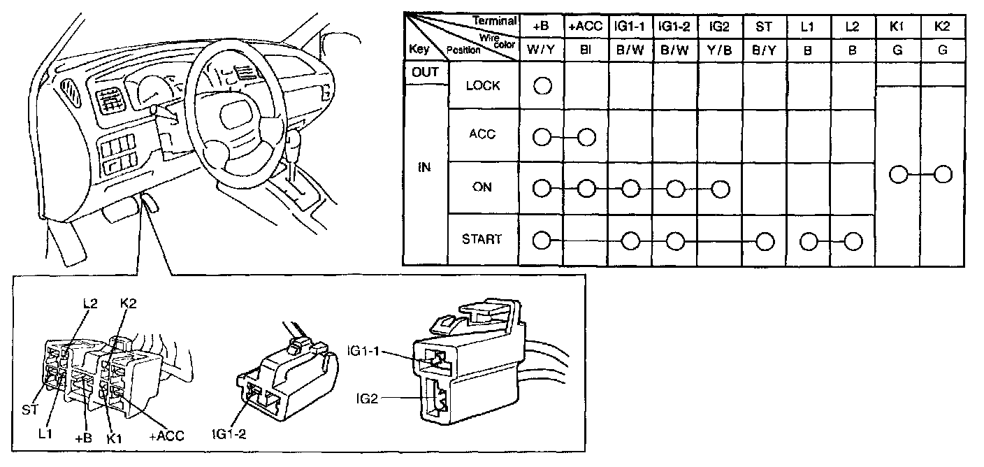 4. Check continuity between terminals. Use circuit tester to check continuity at each switch position. If continuity is not obtained according to the table above, replace ignition (main) switch.