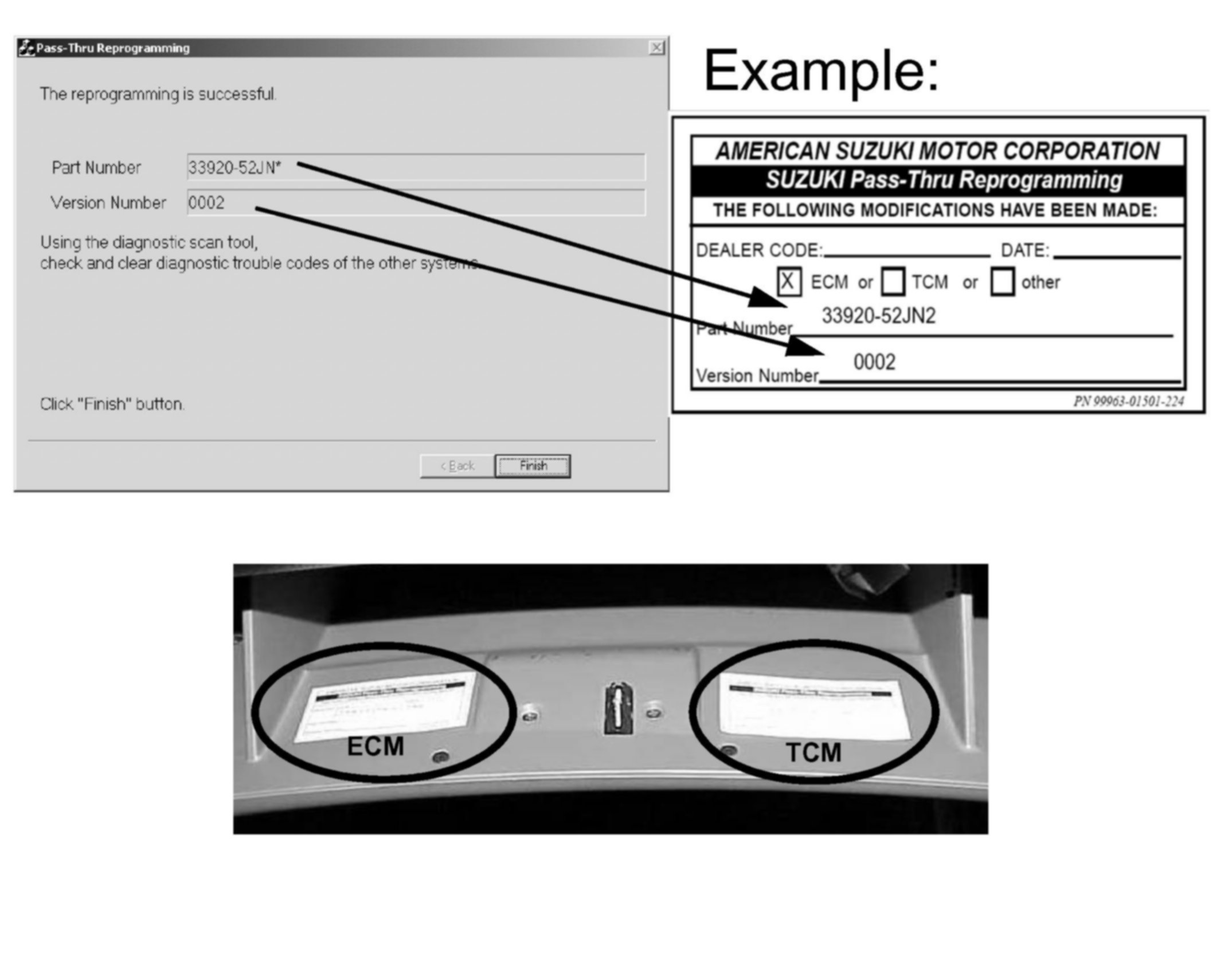 6. Fill out the Reprogram Label P/N 99963-01501-224 (the part number and version will be displayed at the "The reprogramming is successful" screen). Then affix the label to the back of the glove box door as pictured.