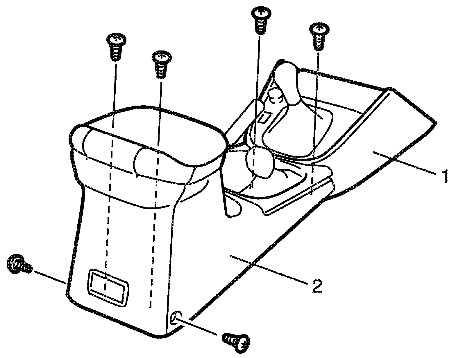 3. Remove rear center console box (2) and front center console box (1) by removing screws.