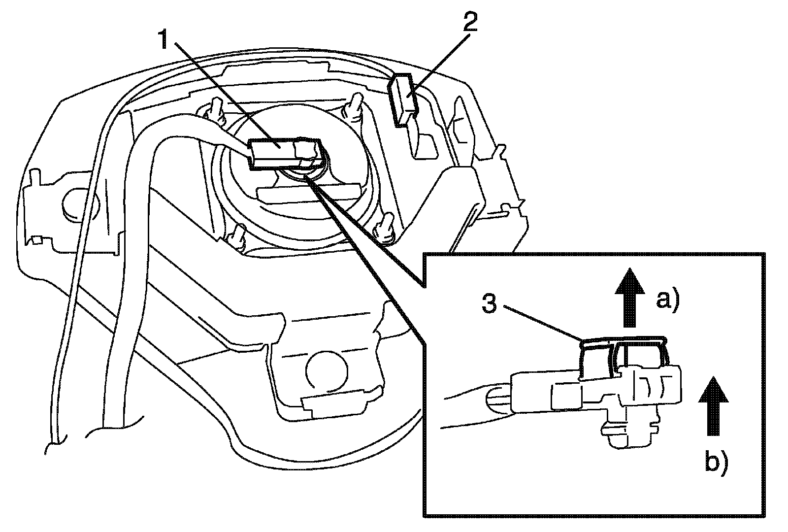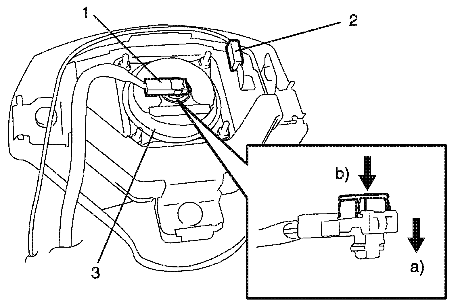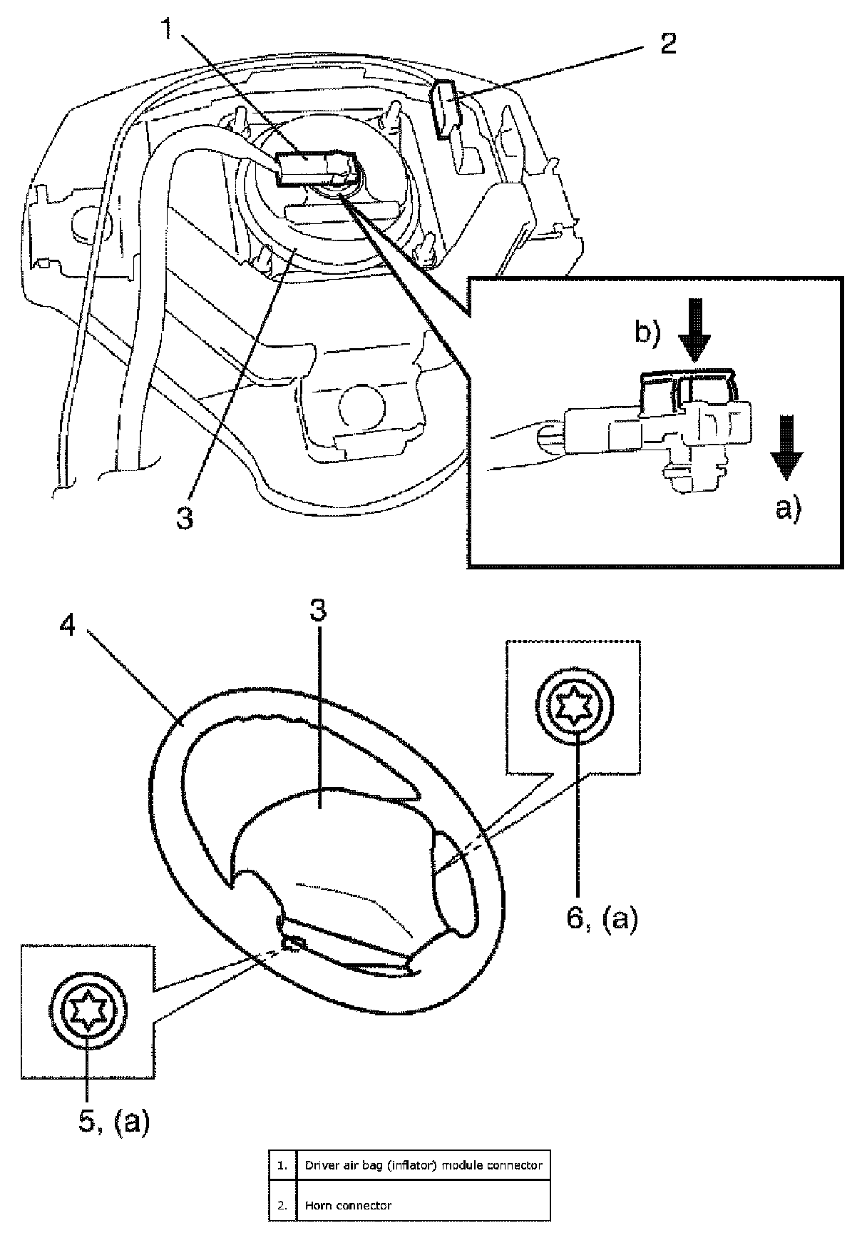 5. Disconnect driver air bag (inflator) module connector (1) of driver air bag (inflator) module (3) and horn connector (2) as shown in the figure.