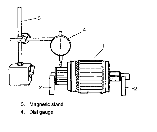- Check commutator for uneven wear with armature (1) supported on V-blocks (2). If deflection of dial gauge pointer exceeds limit, repair or replace.
