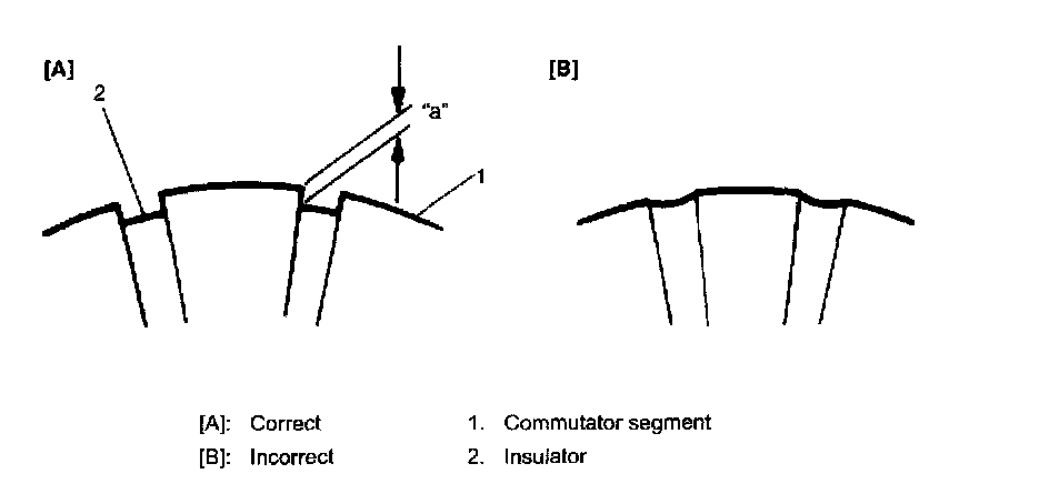 - Inspect commutator for insulator depth. Correct or replace if below limit.