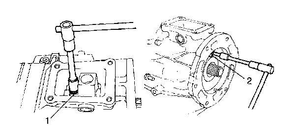 35) Remove reverse idle gear (1) and shaft (2).