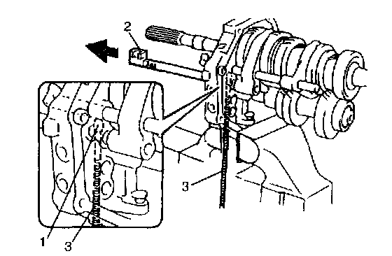 20) Remove reverse gear shift shaft (2), locating roller No. 1 (1), and reverse gear shift link component (3).