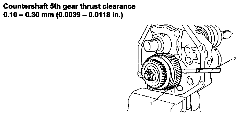 29) Check countershaft 5th gear (1) thrust clearance by using thickness gauge (2).