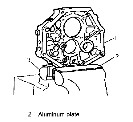 1) Set intermediate case (1) to vise (3). Clean mating surfaces of intermediate case both sides, if intermediate case is reused.