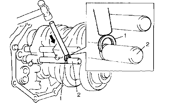 12) Install needle bearing (1), counter shaft 5th gear (2) and synchronizer ring.
