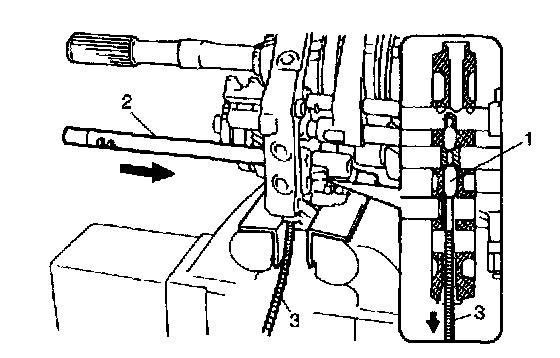 43) With tip end of gear shift shaft inner lever (1) hooked on head of gear shift shaft (2), insert gear shift inner shaft (3) into gear shift shaft inner lever.
