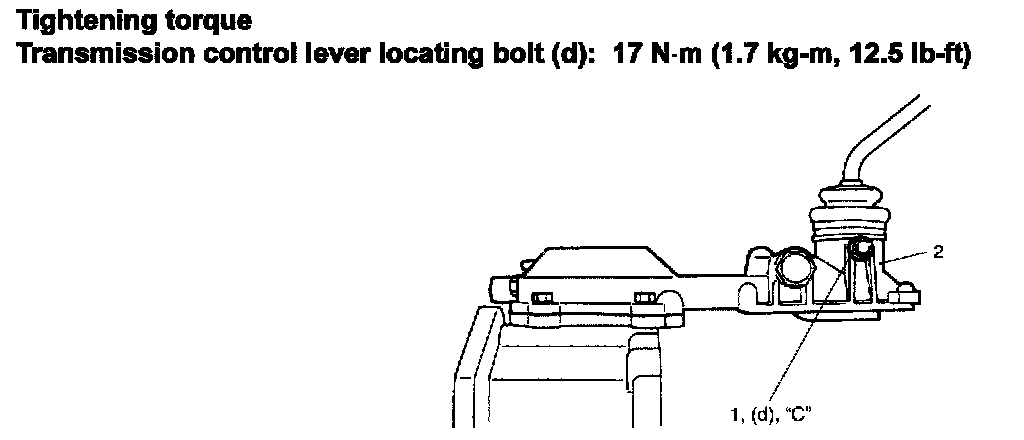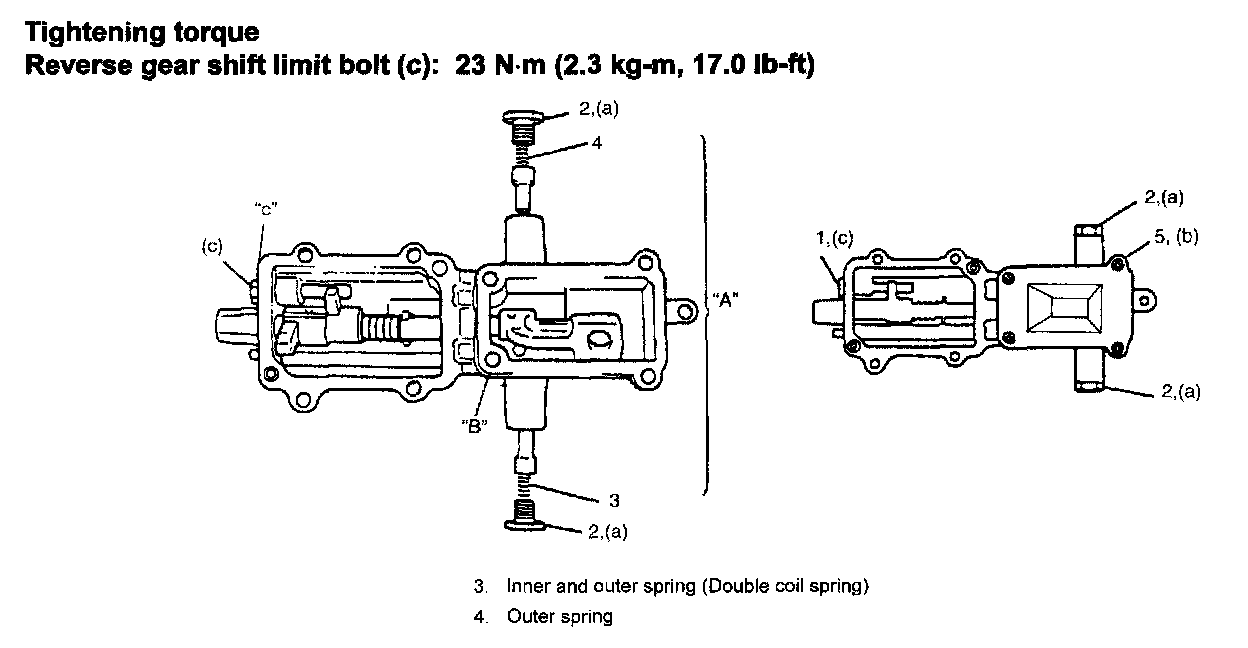 11) If reverse gear shift limit bolt (1) has been removed, apply thread lock cement "C" to bolt then install and torque it to specification.