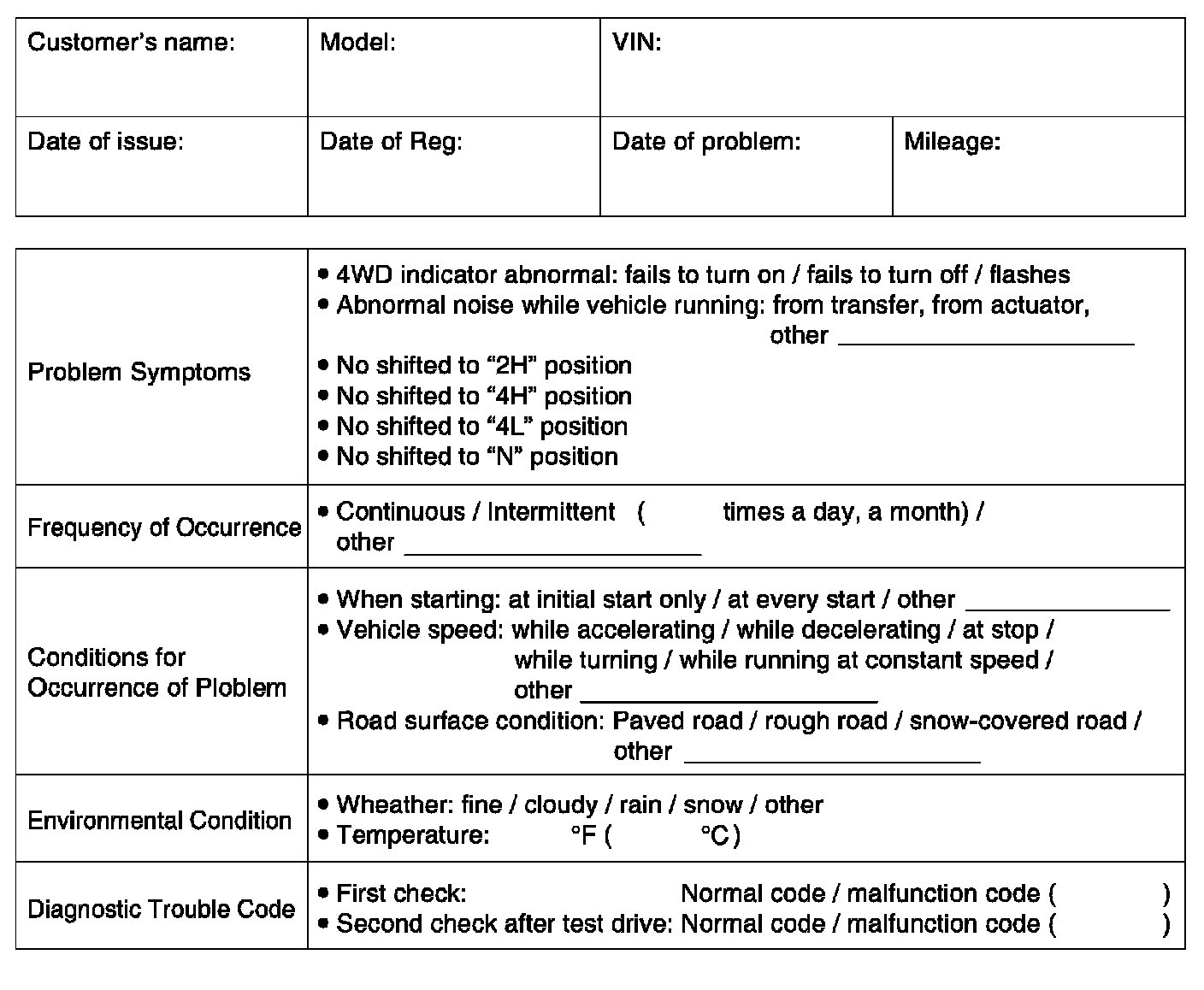 Be sure to perform visual check of the items that support proper function of the 4WD control system referring to Visual Inspection: Motor-Shift Type. Check the part of system suspected as a possible cause referring to 4WD Control Symptom Diagnosis:Motor-Shift Type.