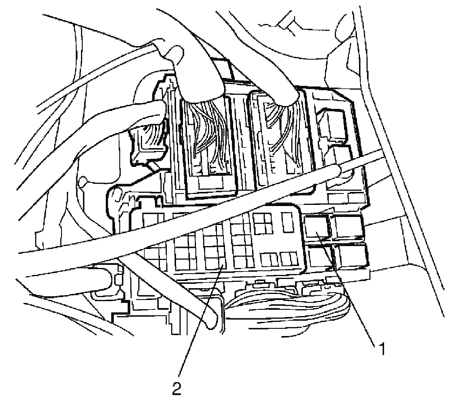 2. Remove rear window defogger relay (1) from fuse / relay box (2).