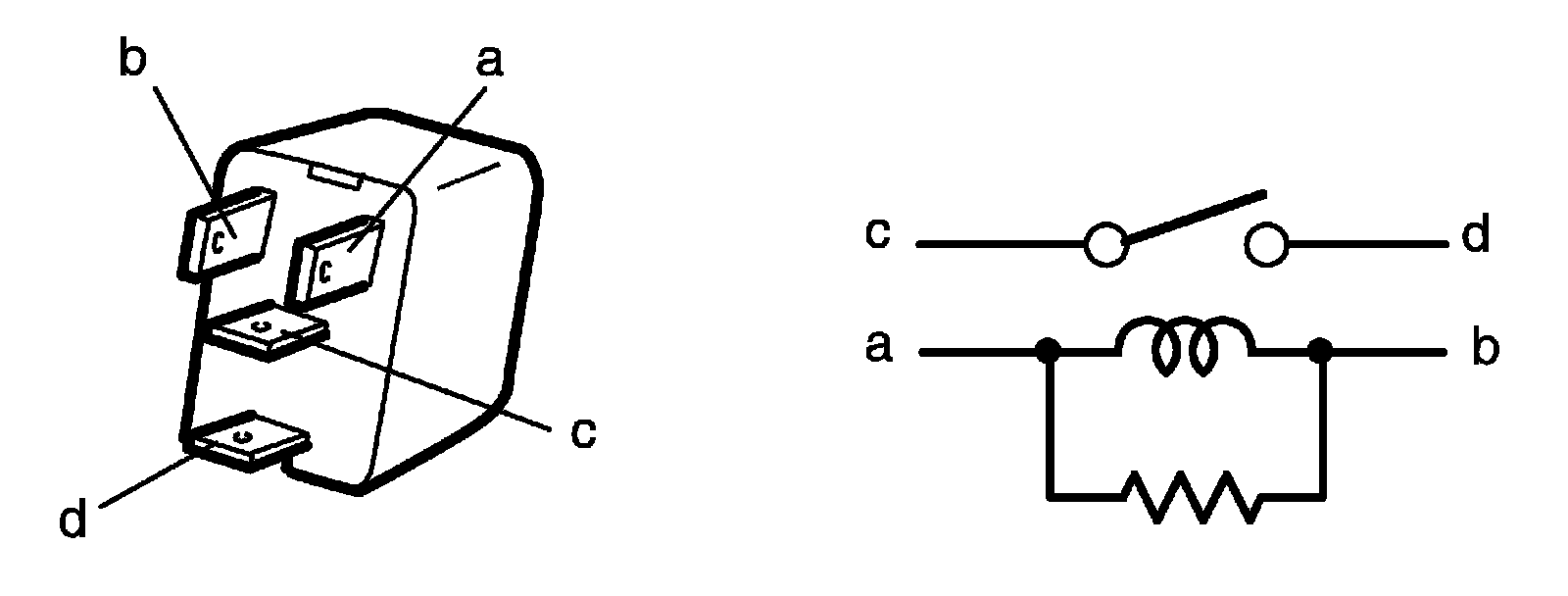 3. Check that there is no continuity between terminal "c" and "d". If there is continuity, replace relay.