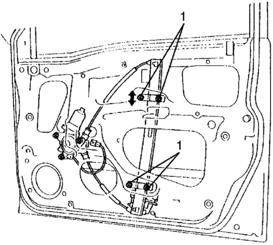 ^ When window becomes hard to raise and lower, adjust screws (1) to correct tilted glass as shown in the figure.
