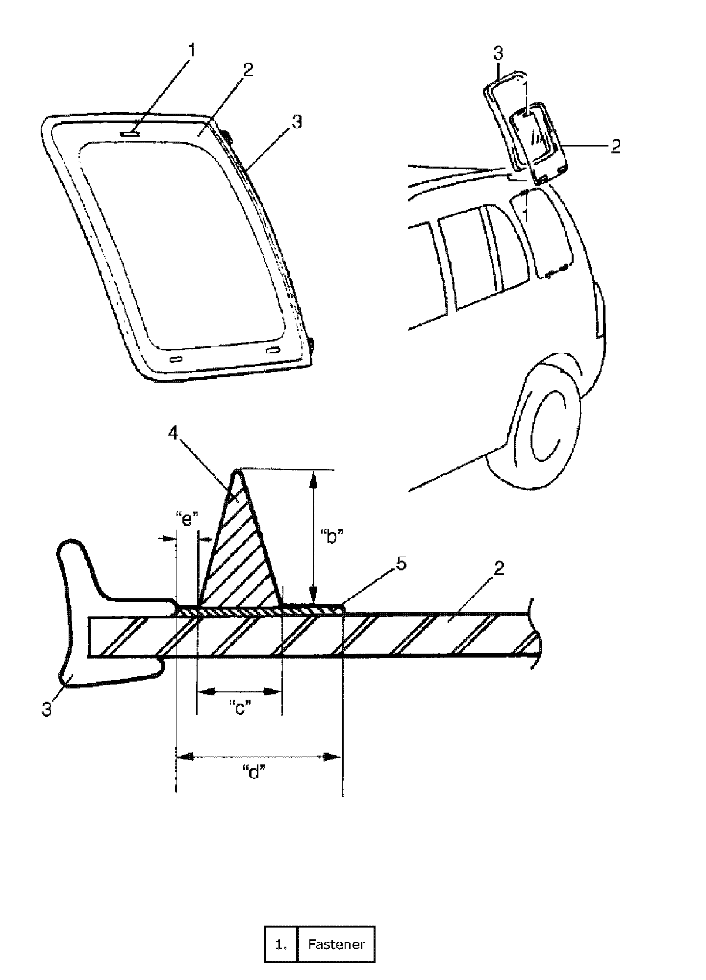 - Before applying primer (5) to glass edge, install molding (3) according to installing position shown in the figure.