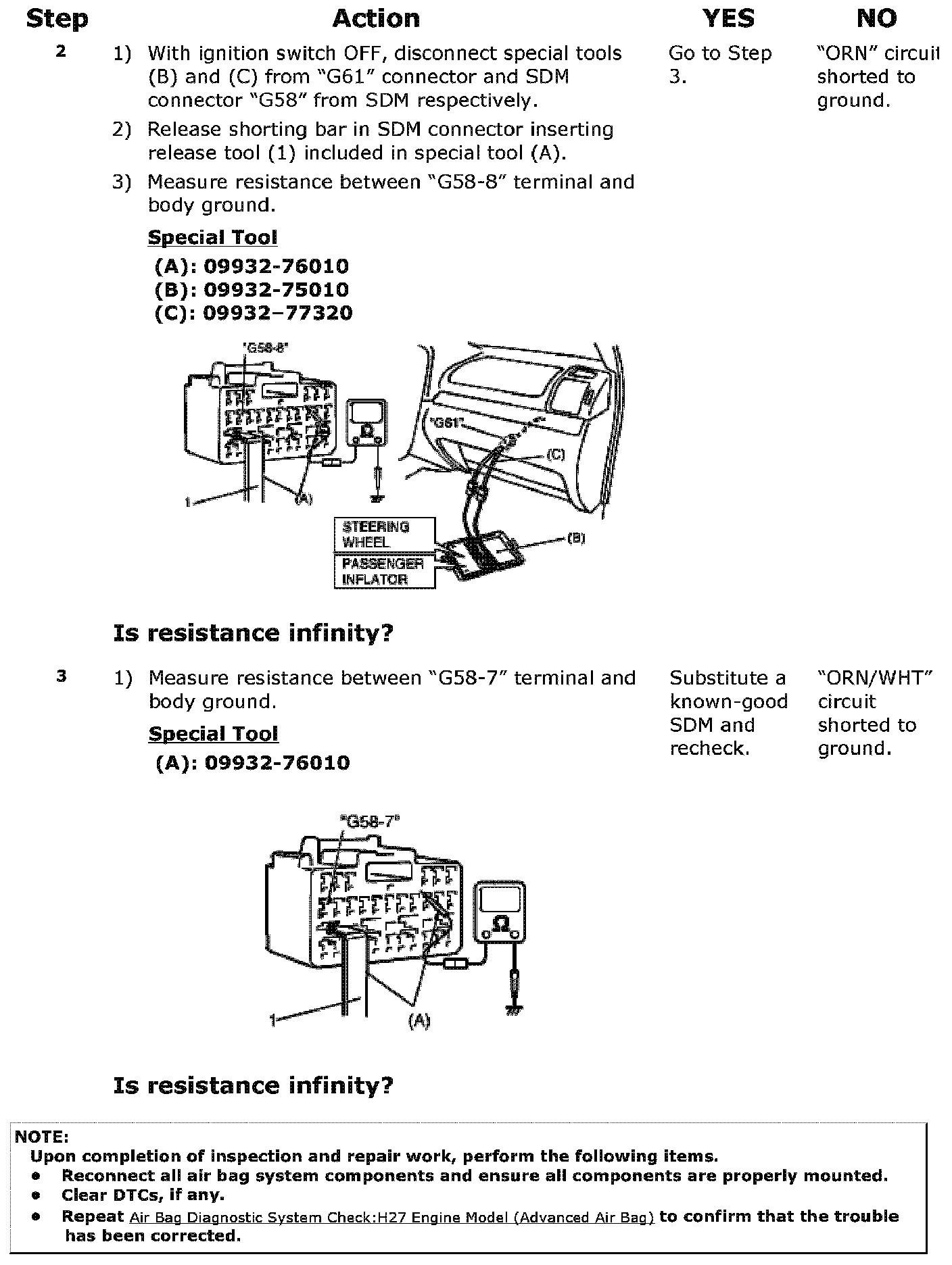 - If there is open circuit in the air bag wire harness, connector or terminal is found damaged, replace the wire harness, connector and terminal as an assembly.