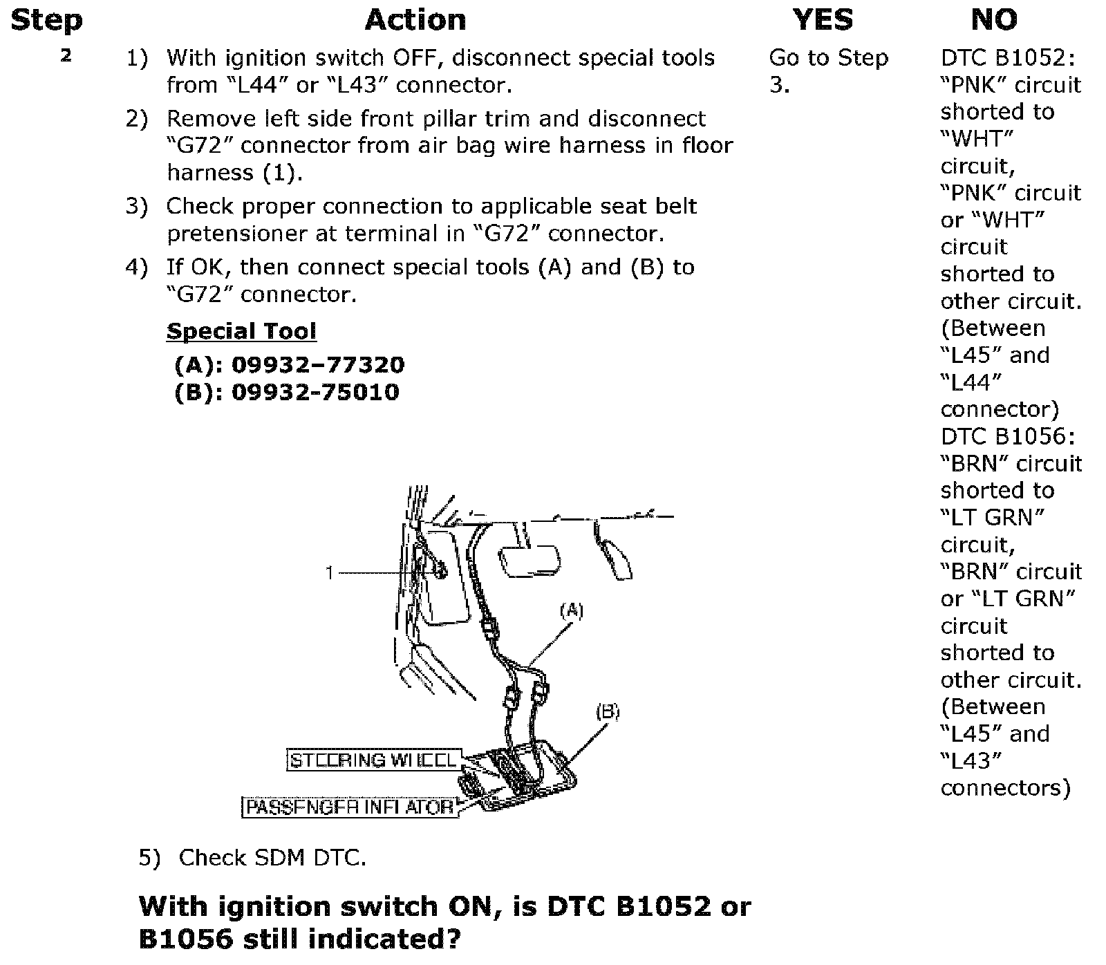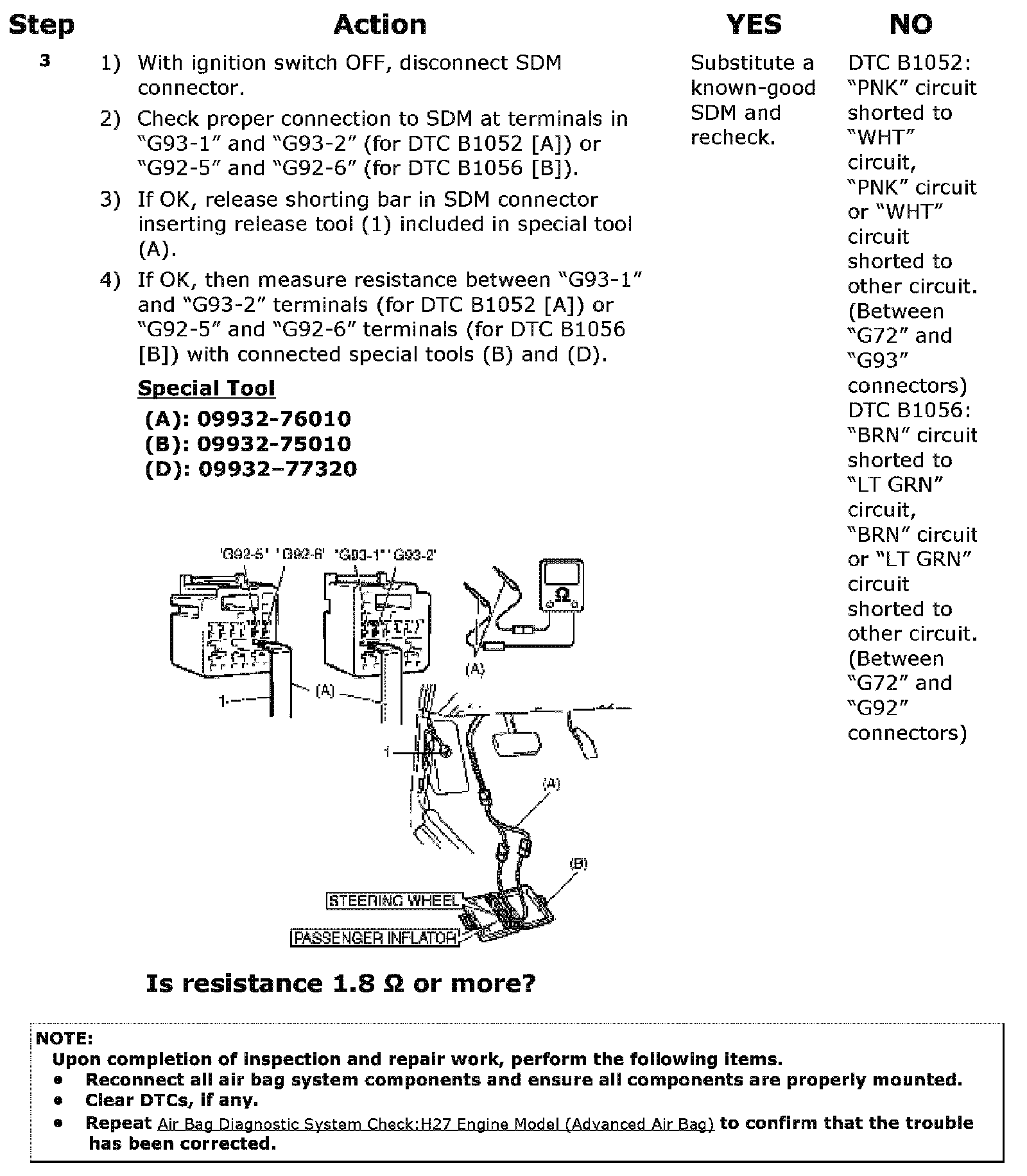Step 3: Check seat belt pretensioner initiator circuit. (Between "G72" and "G93" or "G72" and "G92")