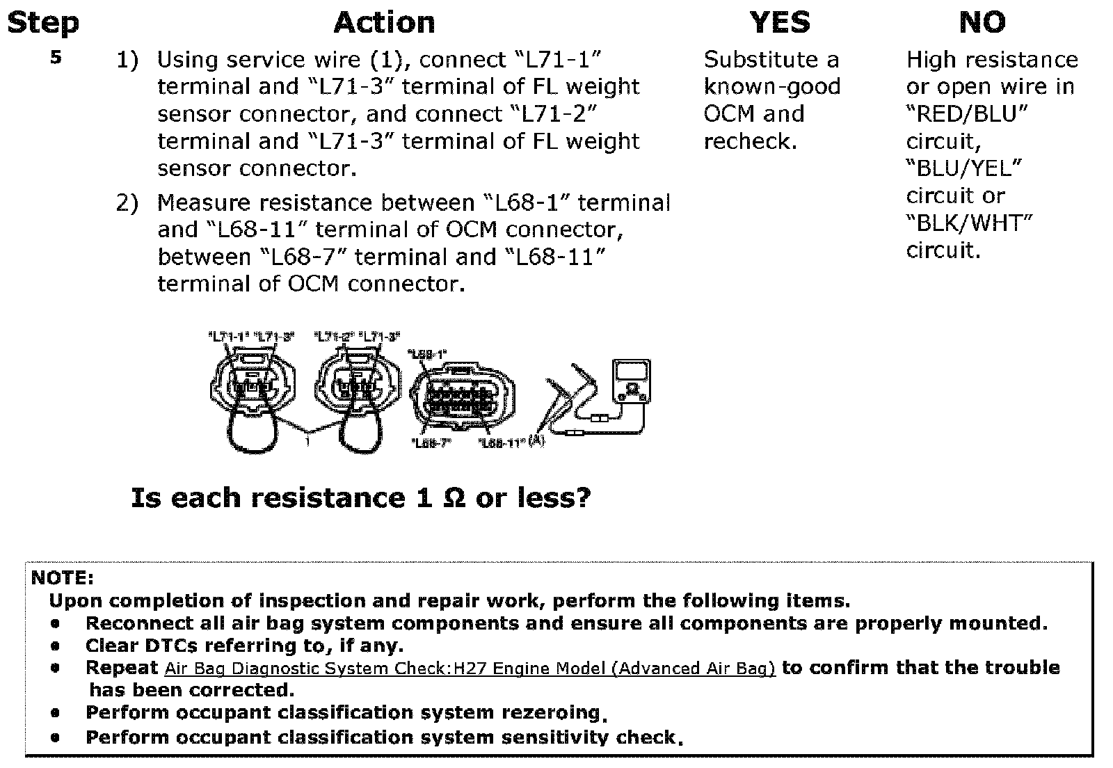 Step 5: Check for high resistance or open wire in FL weight sensor circuit.
