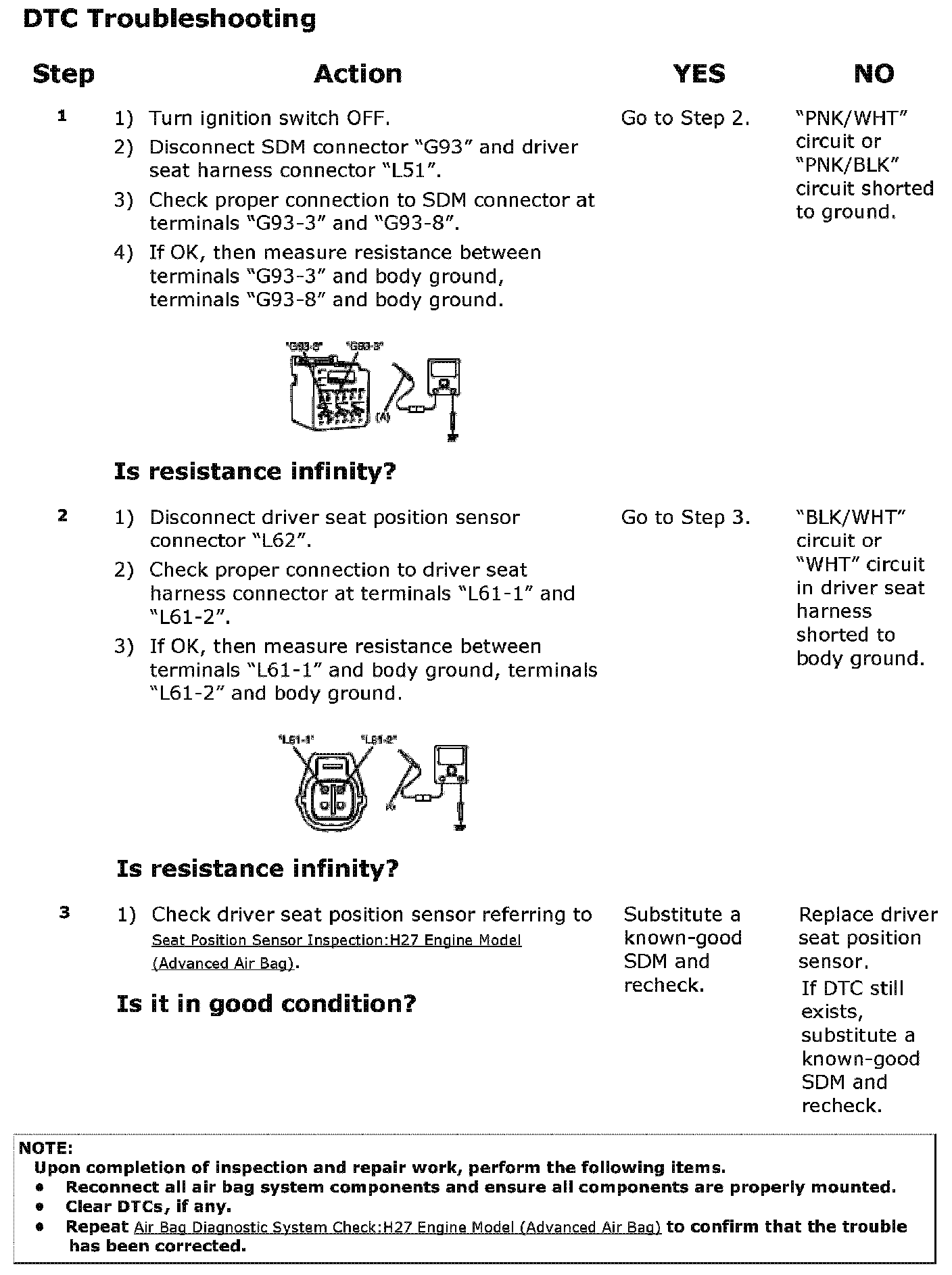 Step 1: Check if driver seat position sensor circuit is shorted to ground (in instrument panel and floor harness).