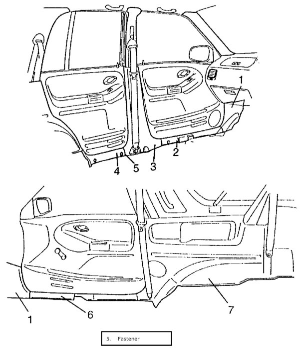 3. Remove dash side trims (1), front side sill scuffs (2) (for 4 door model), center pillar inner lower rims (3) (for 4 door model), rear side sill scuffs (4) (for 4 door model), side sill scuffs (6) (for 2 door model) and rear quarter lower trim (7).