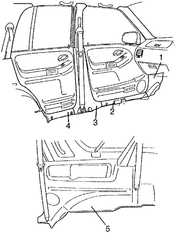 4. Remove dash side trims (1), front side sill scuffs (2), center pillar inner lower trims (3), rear side sill scuffs (4) and rear quarter lower trims (5).