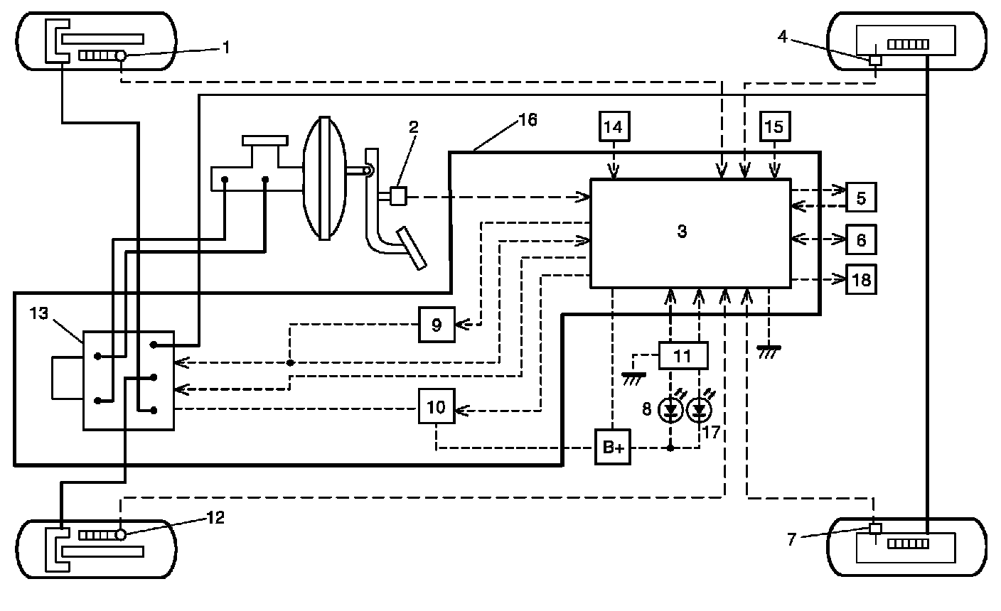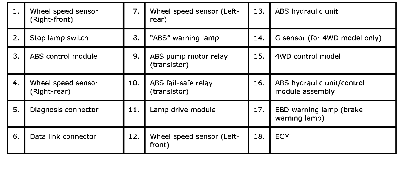 While braking is applied, but before ABS control becomes effective, braking force is distributed between the front and rear so as to prevent the rear wheels from being locked too early for better stability of the vehicle. The main component parts of this ABS include the following parts in addition to those of the conventional brake system.
