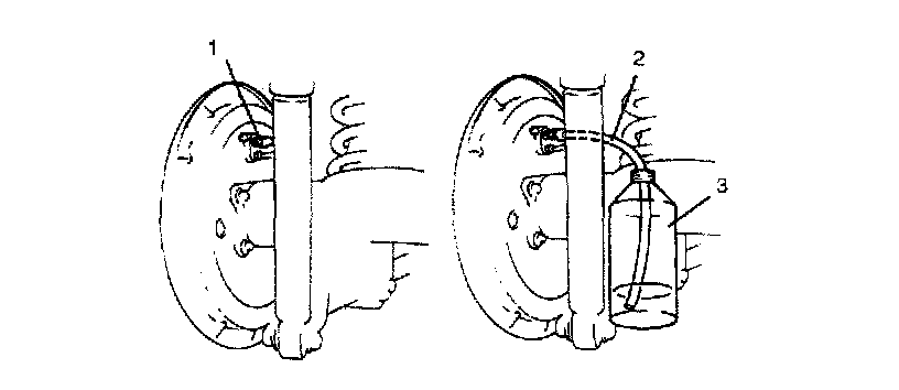 2. Remove bleeder plug cap (1). Attach a vinyl tube (2) to bleeder plug of wheel cylinder, and insert the other end into container (3).