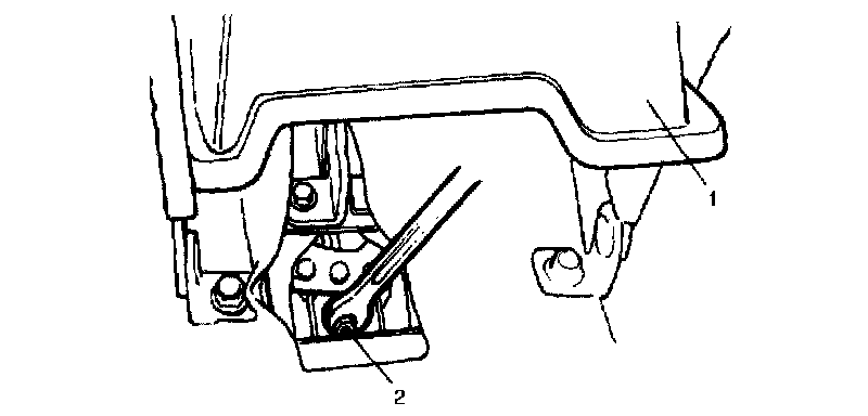 4. Remove parking brake lever cover screws and with rear part of brake lever cover (1) lifted a little, loosen parking brake cable locking nut (2).
