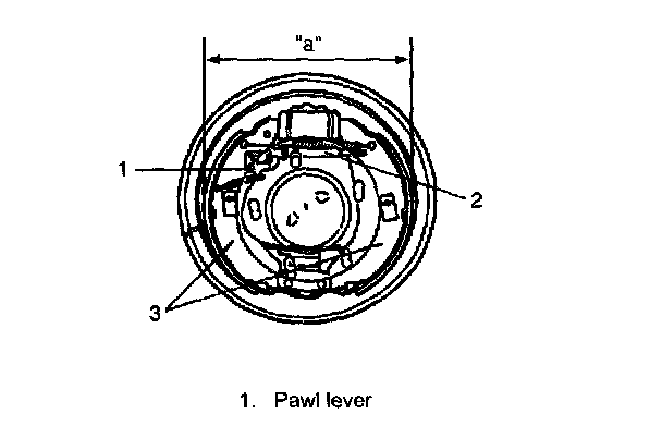1. Before installing brake drum, check outer diameter of brake shoes (3). If it is not within value as specified, adjust it to specification by turning adjuster (2).