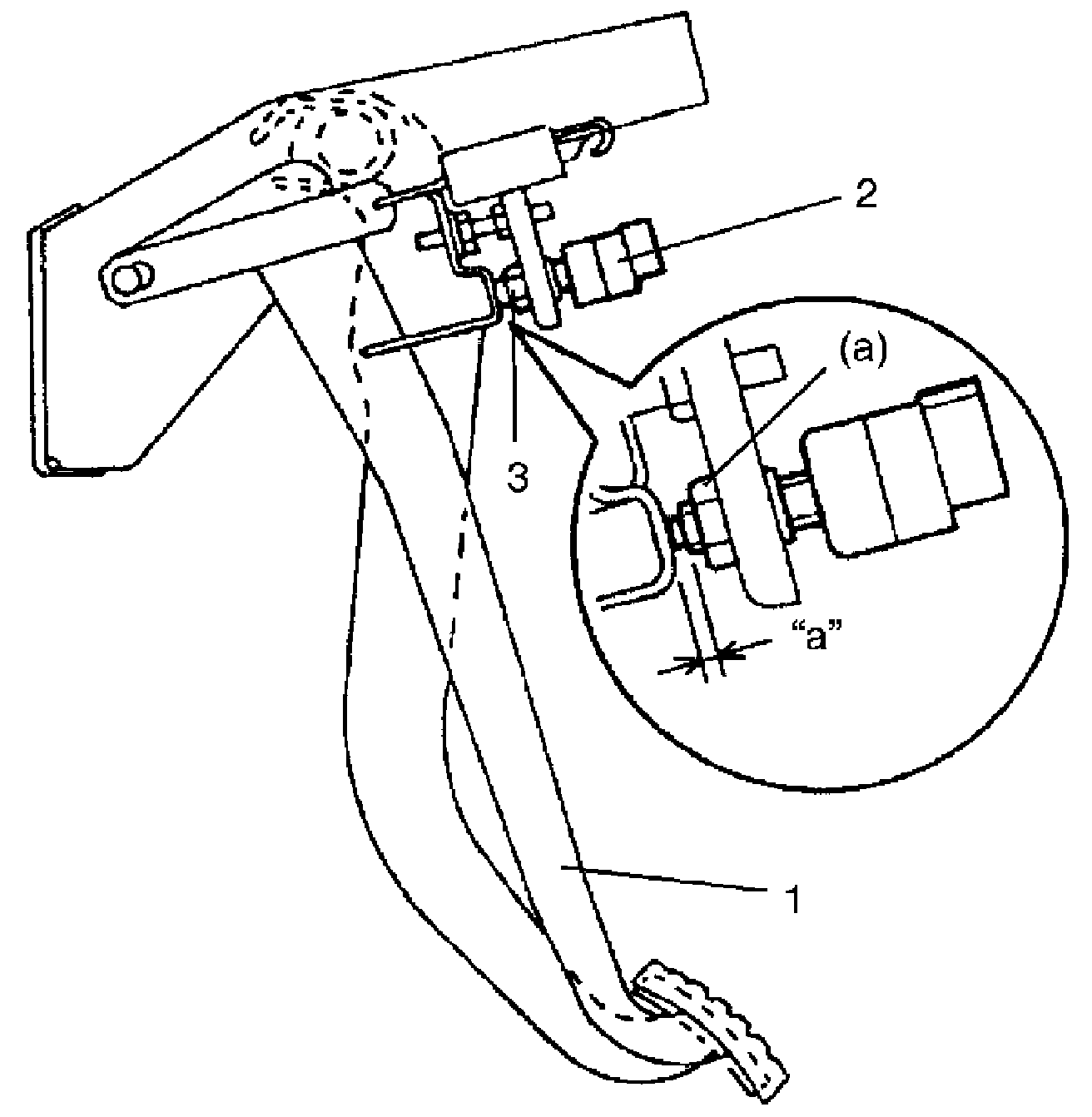 2. With clutch pedal (1) released, adjust switch position so that clearance between end of thread and clutch pedal bracket is within specification.