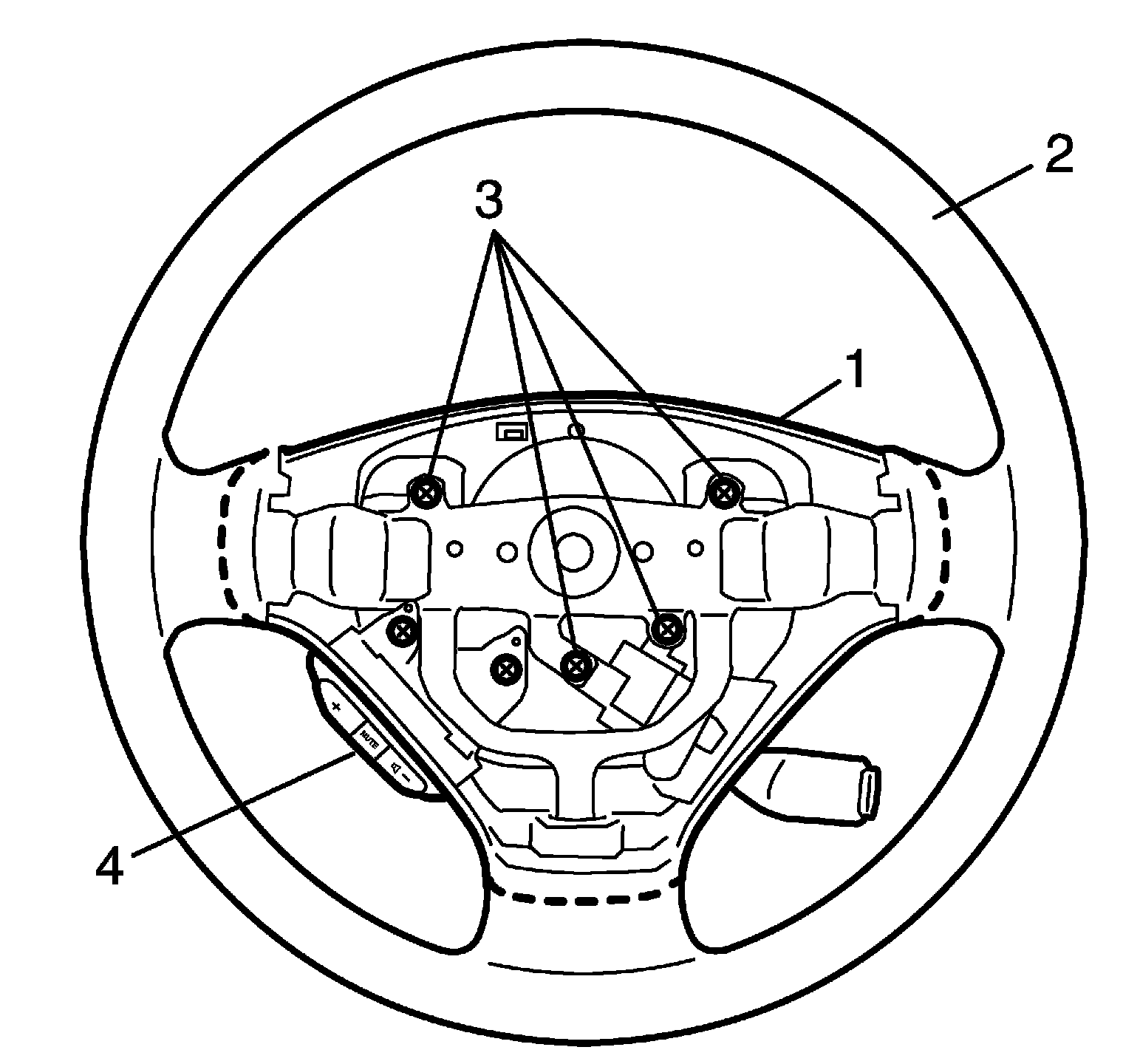 5. Remove cruise control switch assembly (1) from steering wheel lower cover (2) removing cruise control lever bolt (3) and cruise control switch assembly screw (4).